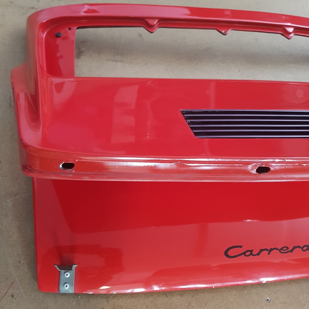 Spoiler / alerón trasero con tapa de motor en fibra de vidrio para Porsche 911 3.0L Turbo RS / RSR. Modelo de dos rejillas, réplica, correspondiente al periodo correcto (1974–1977).